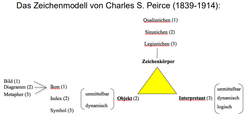 Peirce entwickelte ein Zeichenmodell, das auf drei Komponenten basiert: