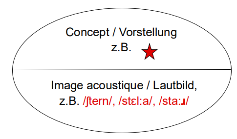 Saussures Zeichenmodell: Ein Zeichen besteht aus zwei Teilen: dem Signifikant (Lautbild) und dem Signifikat (Vorstellung).