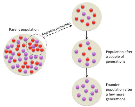 - Founder effect: occurs after a small number of individuals colonise a new area
