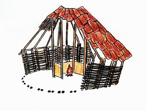 * Stick walls covered with clay, a slab roof made from bark, open doorway, and a smoke hole