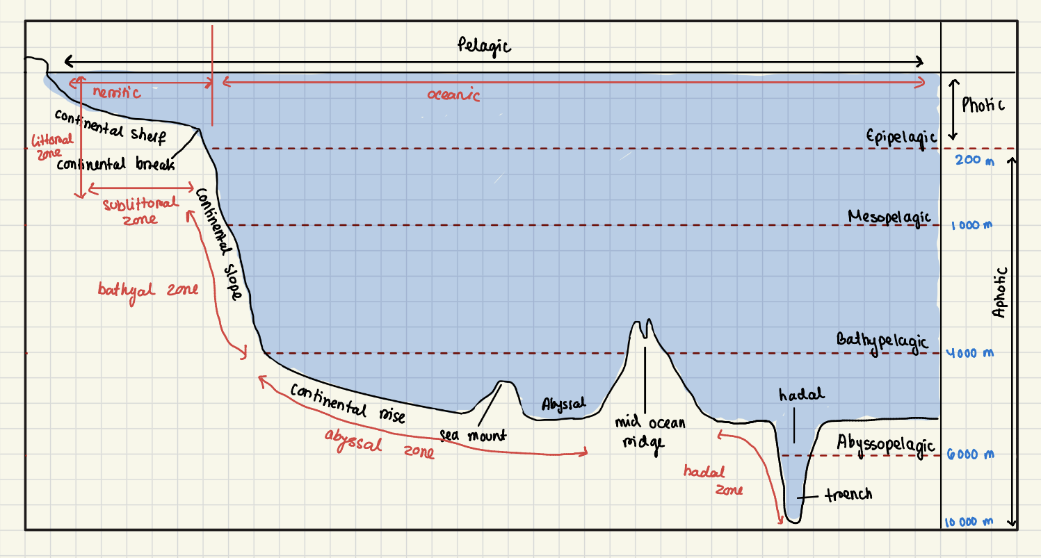 oceanic zone: deep water beyond the shelf
