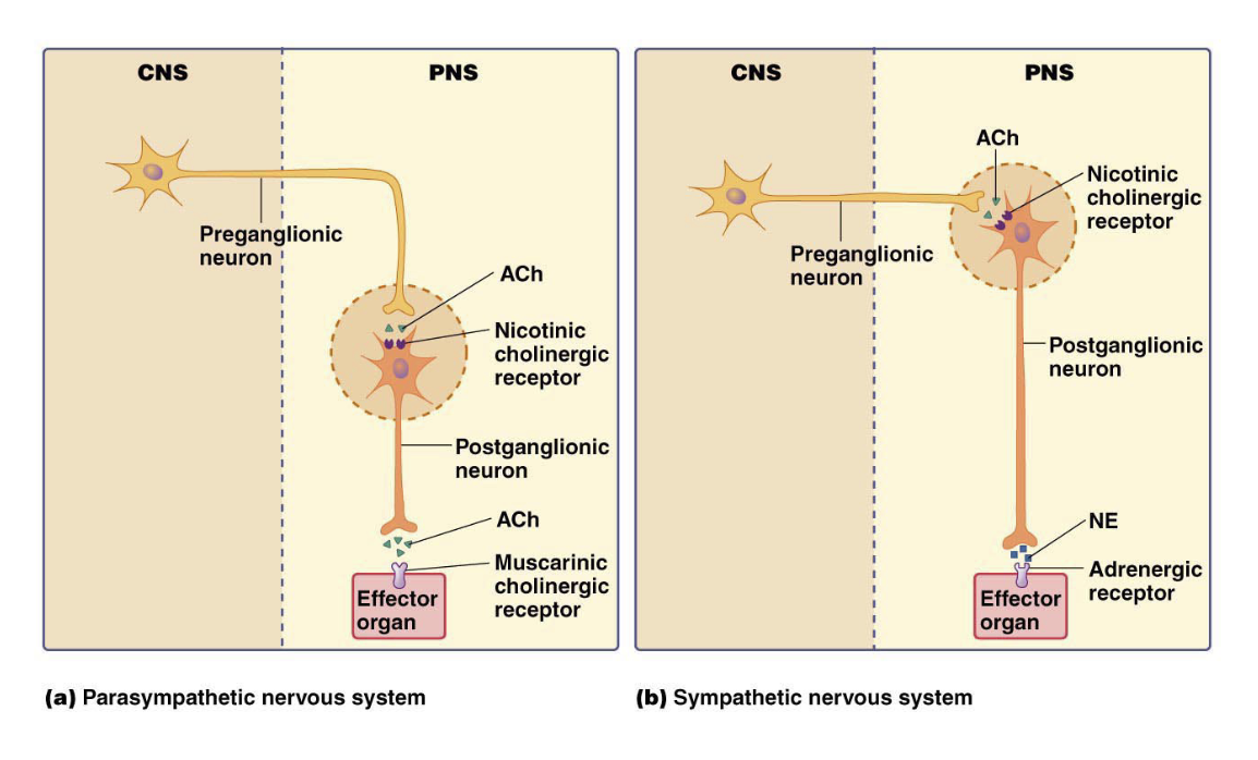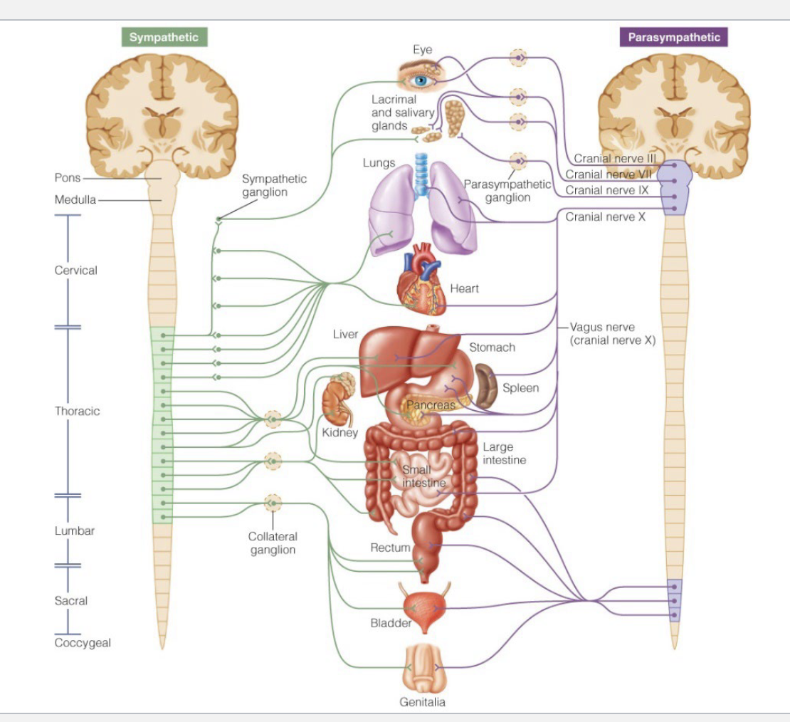Most organs have dual innervation from the parasympathetic and sympathetic branches