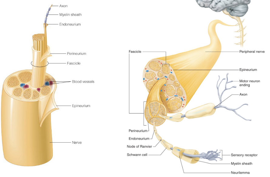 Nerve- a collection of nerve fibers in the PNS-connect sensory organs to CNS. May or may not be myelinated