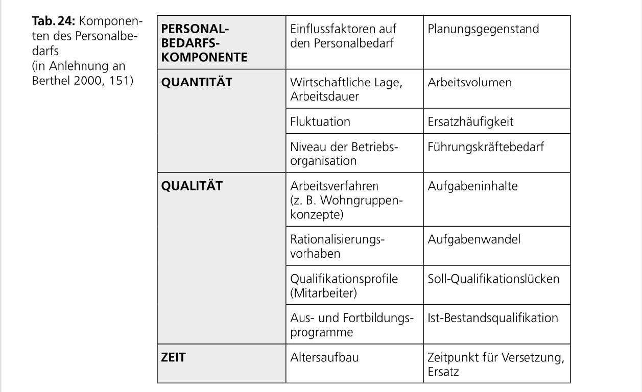 Integrierte Personalplanung: Ableitung des quantitativen und qualitativen Bruttopersonalbedarfs aus der Unternehmensplanung. Schauen: was sind die Aufgaben/Anforderungen an Qualifikation? Was sind die Ressourcen - Gelder/verfügbarjeit etc.? ← würde ich mir selber so erklären - kp warum das „integriert“ dann heisst ———> A: „integriert“ heisst einfach, dass die Personalplanung nicht für sich steht also nicht nur von Verfügbarkeit und Stundensatz abhängt, sondern von anderen Prozessen im Unternehmen abhängig ist und auf diese abgestimmt werden muss (siehe weiter unten: Exkurs „integrierte Personalplanung“
