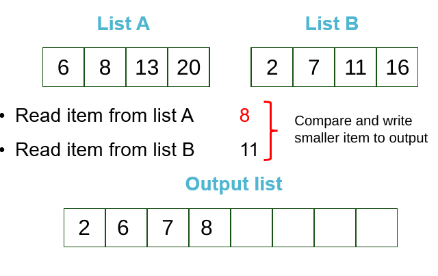 You then go through, comparing 2 lists together. With lists of more than one, you reorder within sublists. This is done by comparing the current first value in each list and then adding the lesser to the new list.