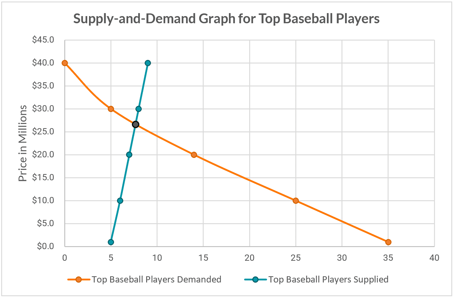 This combination of low supply and high demand results in high prices. Let's take a look at what a supply-and-demand graph might look like for top baseball players.