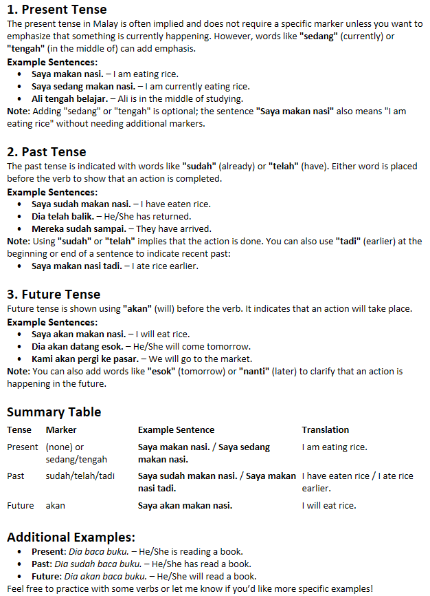 Past | sudah/telah/tadi | Saya sudah makan nasi. / Saya makan nasi tadi. | I have eaten rice / I ate rice earlier. |