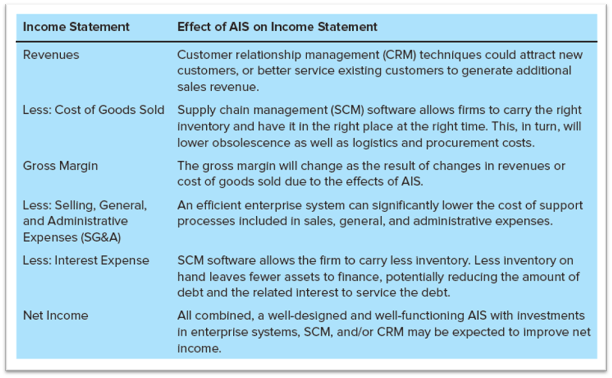 In an academic study, a positive association was found between the level of the firm’s annual AIS investment and its subsequent accounting earnings (as measured by return on assets and return on sales), suggesting that AIS investment does in fact create value.