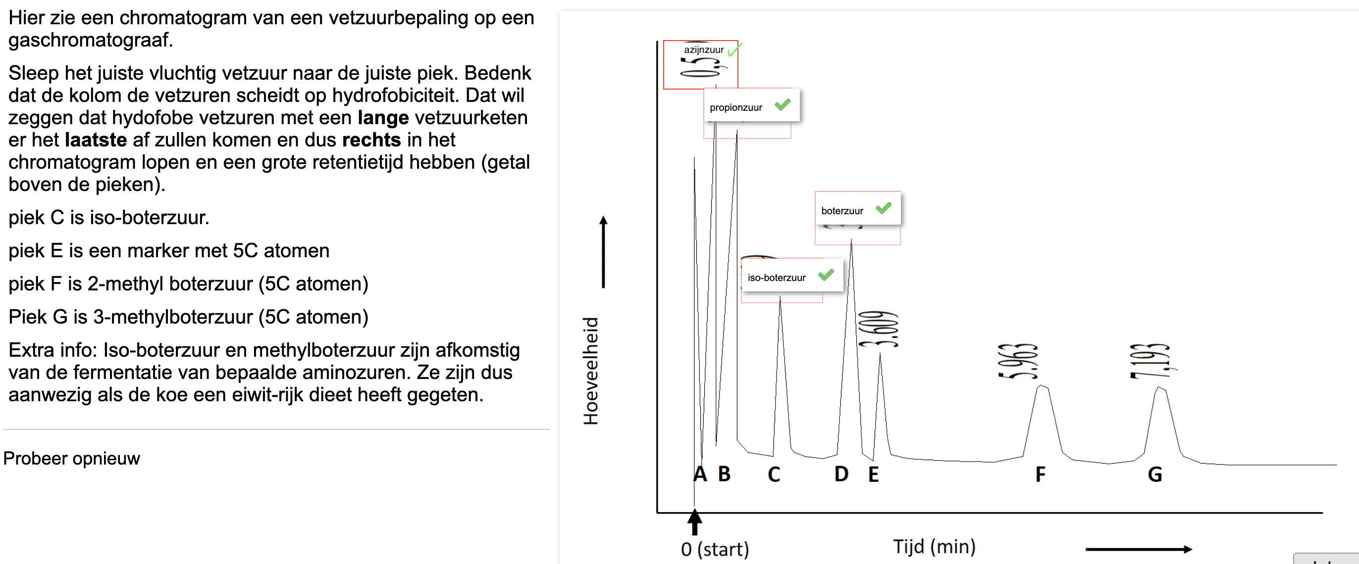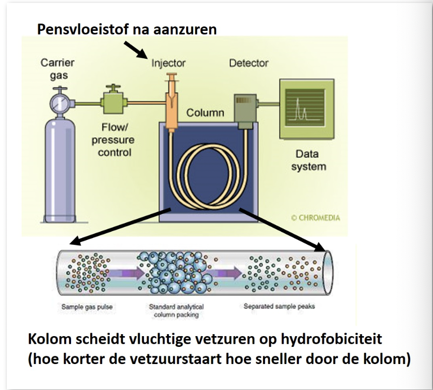 bepalen amount of VVZ: eerst aanzuring vd VVZ (om FA in zure vorm te krijgen) → injectie into column which separates VVZ op hydrofobiciteit (hoe korter de FAstaart, hoe sneller de column) - diagram 1