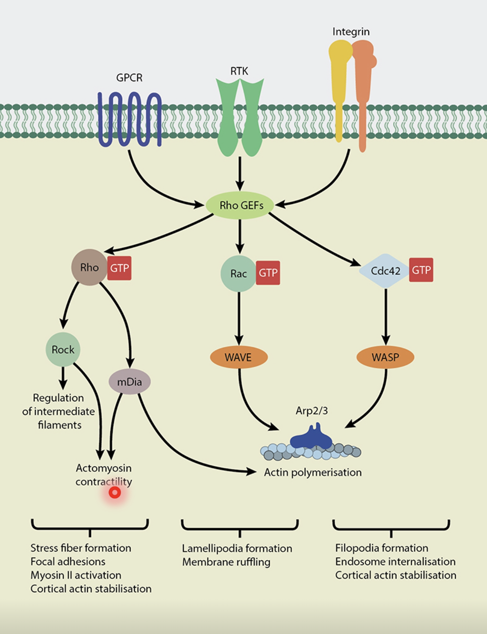 Active Rho (Rho-GTP) activates Rho trigger (ROCK), which phosphorylates downstream targets to activate myosin and trigger actomyosin contractile forces for locomotion