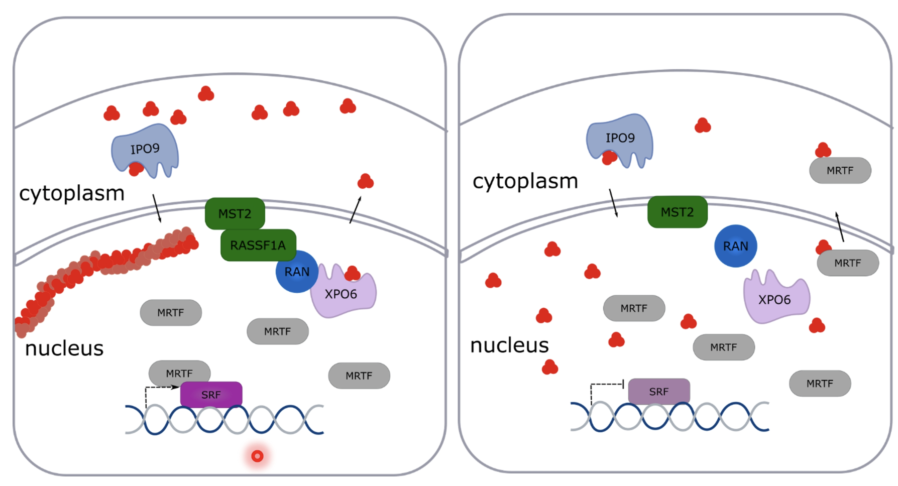 MST2 recruits RASSF1A to the nuclear envelope and RASSF1A interacts with XPO6/RAN to export G-actin, so loss of RASSF1A leads to increase in G-actin in the nucleus