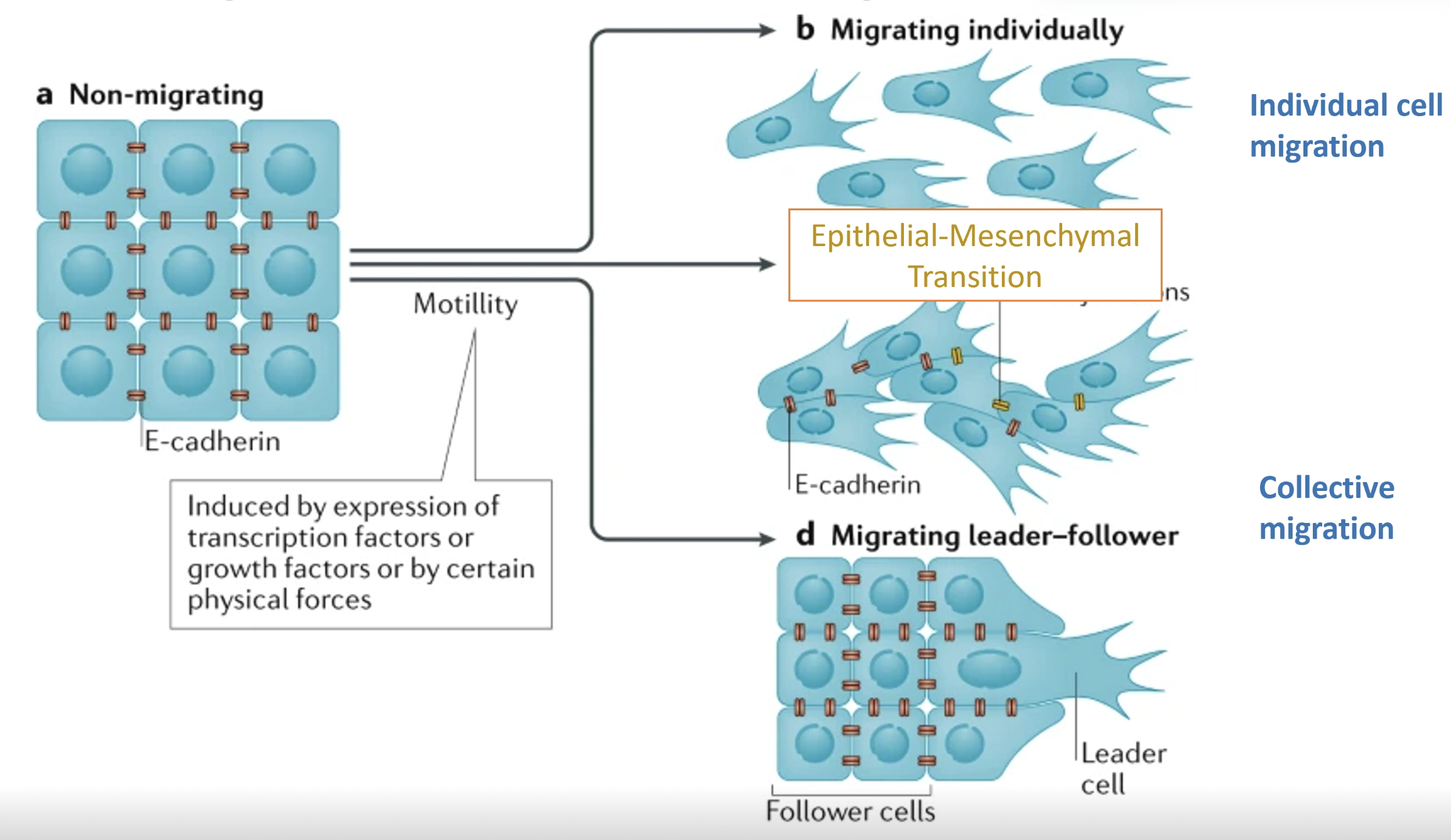 The migrating adherent model and individual migration model involve a cadherin shift (EMT)