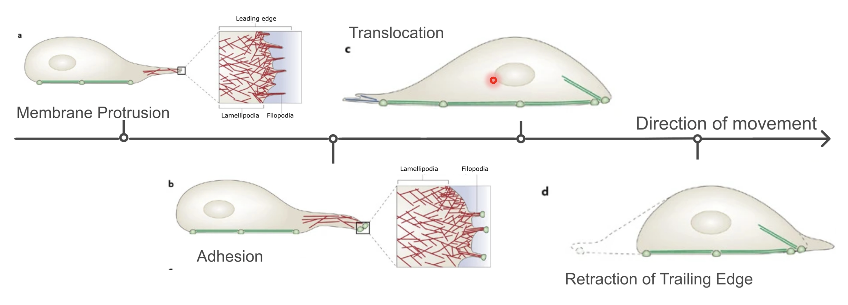 Membrane protrusion (extension of filopodia and lamellipodia) → focal adhesion → translocation (loosening of focal adhesions at the rear) → retraction of trailing edge