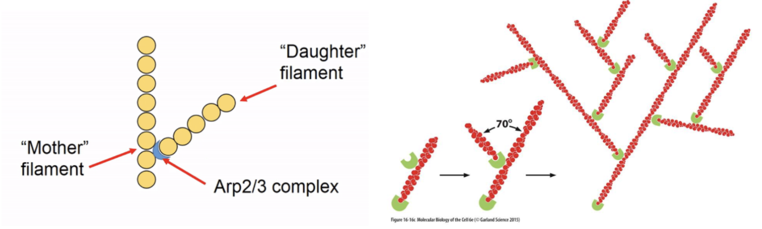 Arp2/3 complexes are the most well-studied - it is a controllable nulceating structure which binds together G-actin monomers to initiate polymersation or binds to existing actin subunits at the ‘mother’ filament to form ‘daughter’ filament branches