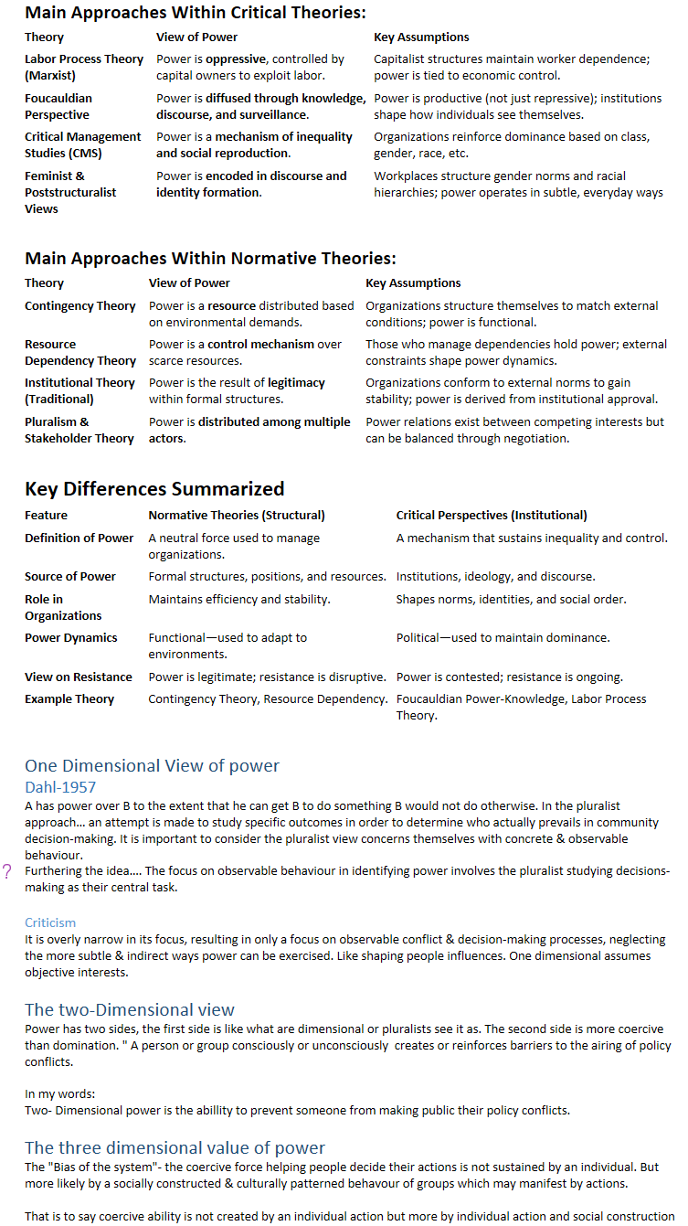 Critical Management Studies (CMS) | Power is a mechanism of inequality and social reproduction. | Organizations reinforce dominance based on class, gender, race, etc. |
