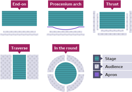 You will be asked four multiple choice questions on theatre roles, stage configurations, and stage positions.
