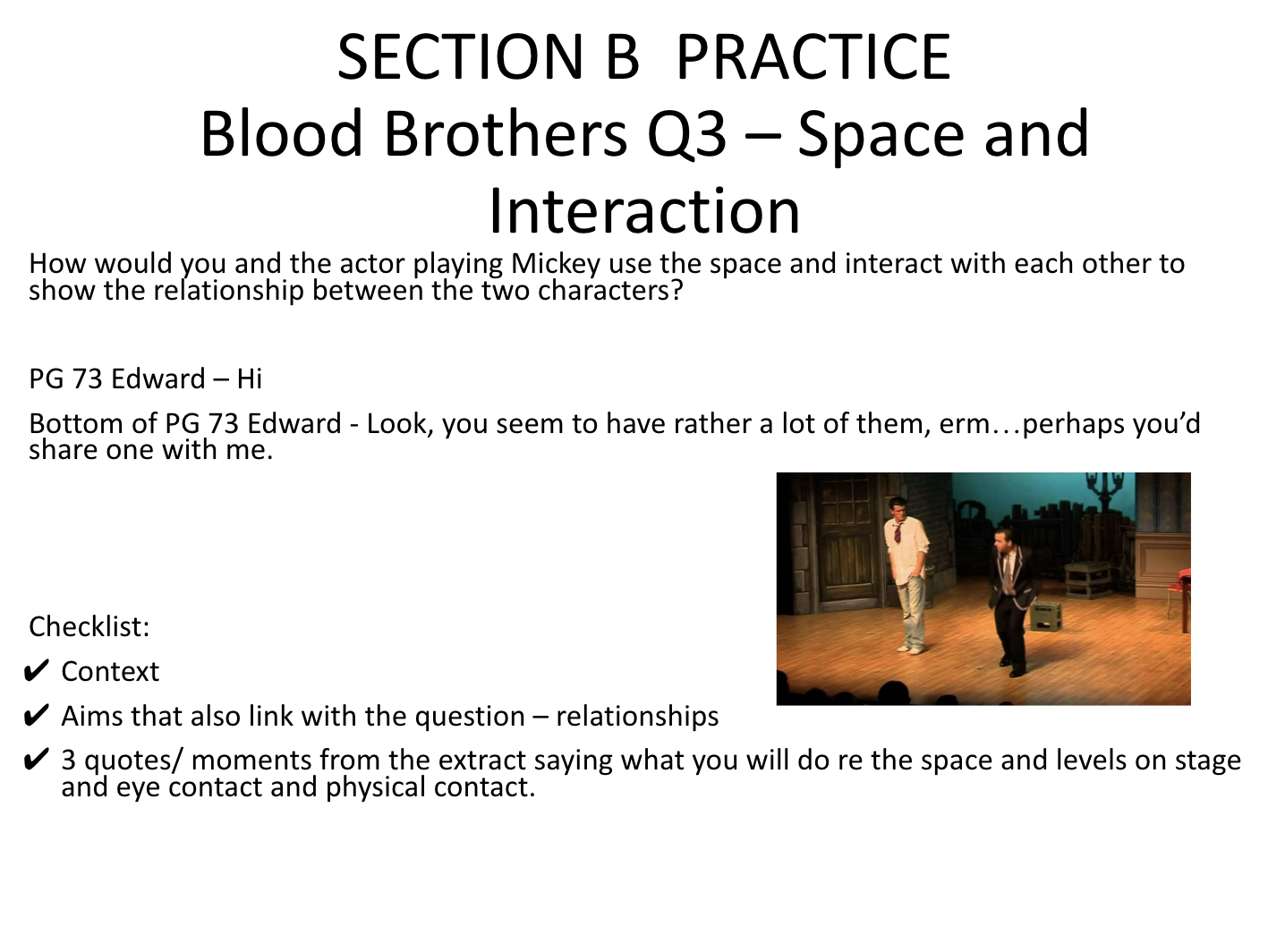 Practice by choosing a random extract from the play and choose 3 moments from that extract. Try describing your use of space, eye contact and physical contact with the other actor(s) in the scene for each of the 3 moments and justify why.
