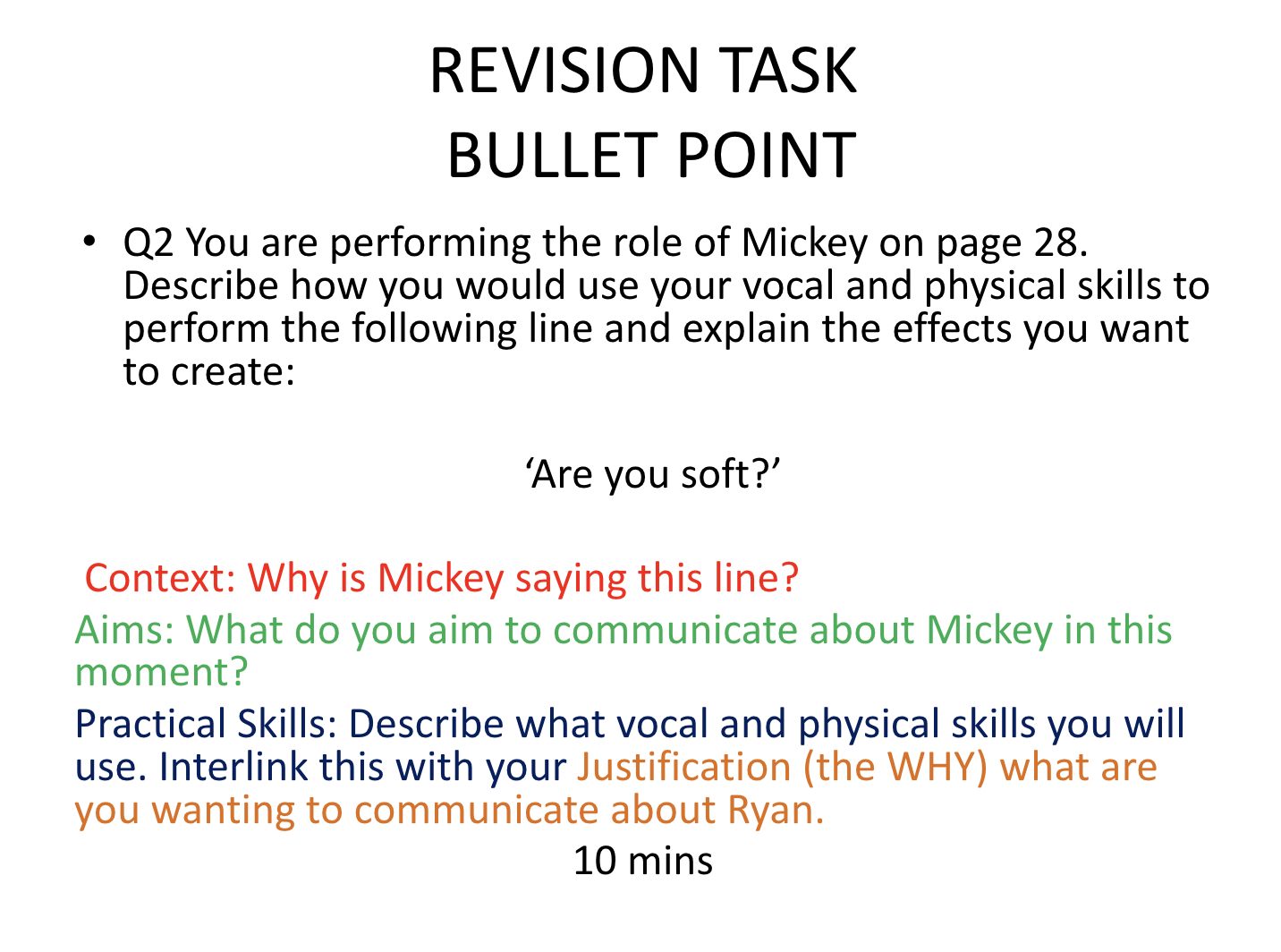 Practice by choosing random lines from the play and try describing how you would deliver the line and justify your reasons why. Go through the drama terminology (create flashcards for vocal and physical terminology – pace, pitch, manner etc).