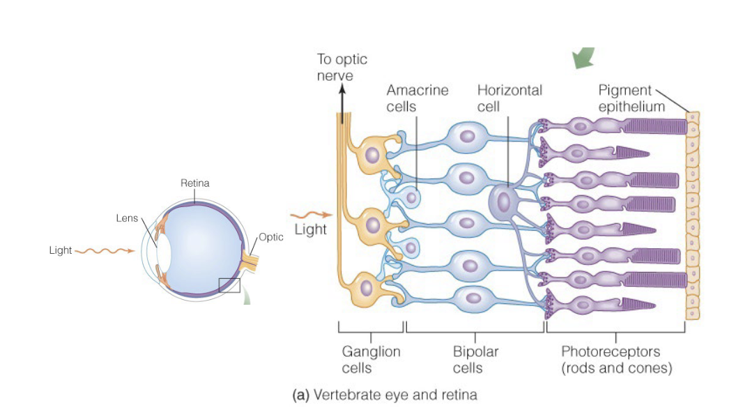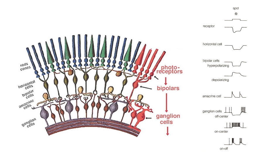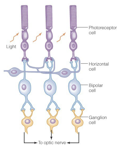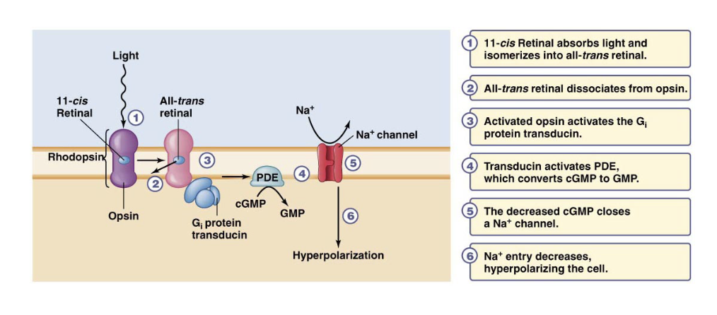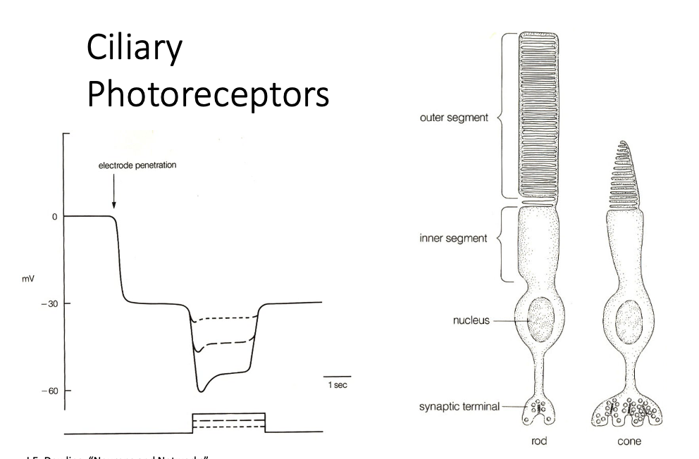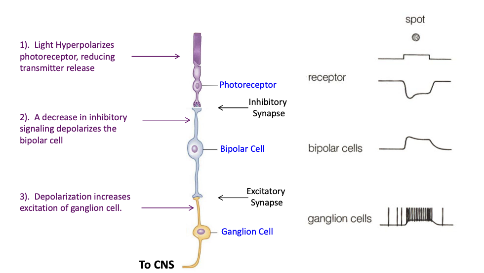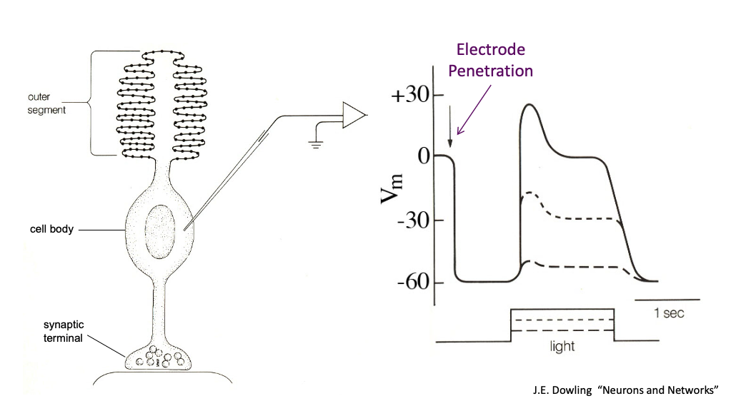 1) light hyper polarizes photoreceptor, reducing transmitter release