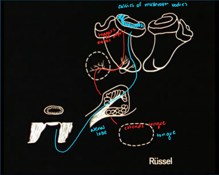 * Know general pathway. Happens bilaterally. Olfactory stimuli and sucrose stimuli use 2 pathways. Goes up into the mushroom bodies and then lateral horn. After repeated measures, won’t need SOG circuit.