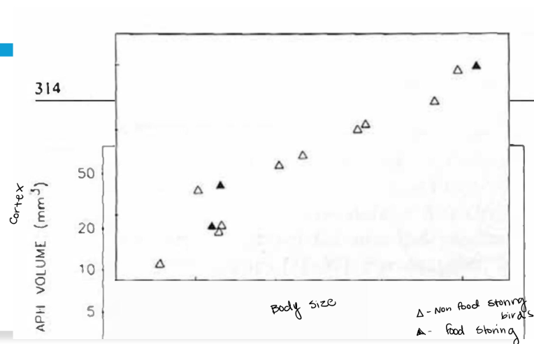 We would expect that bigger birds would have a bigger hippocampus and thus a bigger brain. However, hippocampus is bigger than expected for food storing birds.