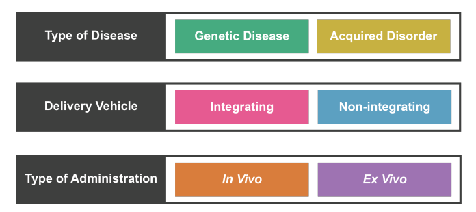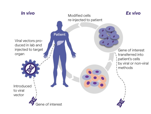 Ex vivo: Gene of interest transferred into patient’s cells. Ex vivo means "out of the living" in Latin.