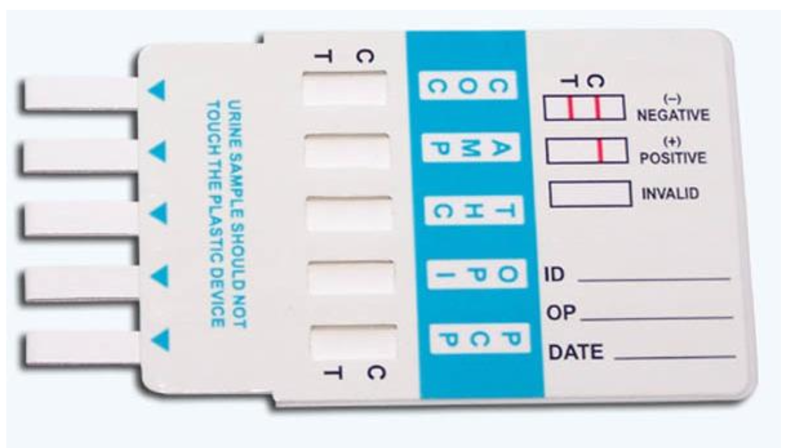Screening: saliva swab → immunoassay panel (amphetamines, THC, opiates, cocaine, etc.).