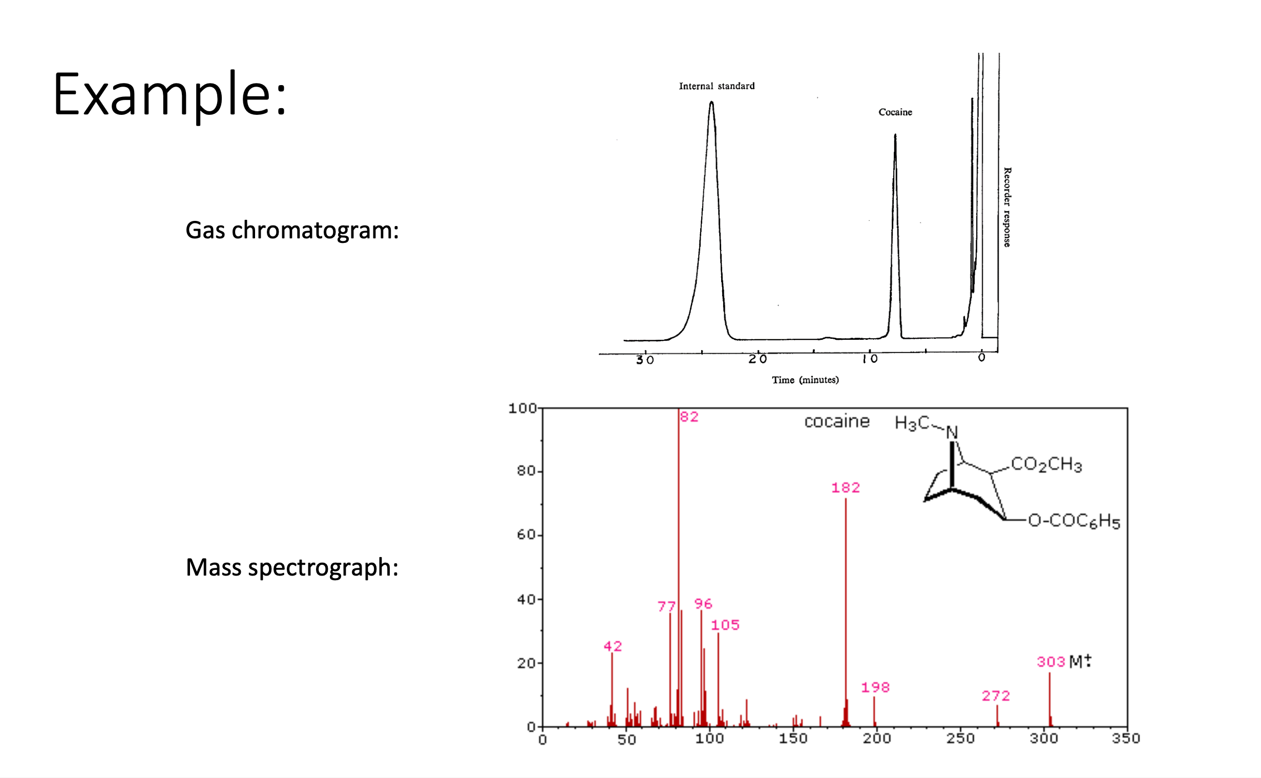 Mass spectrograph displays ion fragments ( values 303, 272, 182, 198, etc.) — unique “fingerprint” verifying cocaine identity.