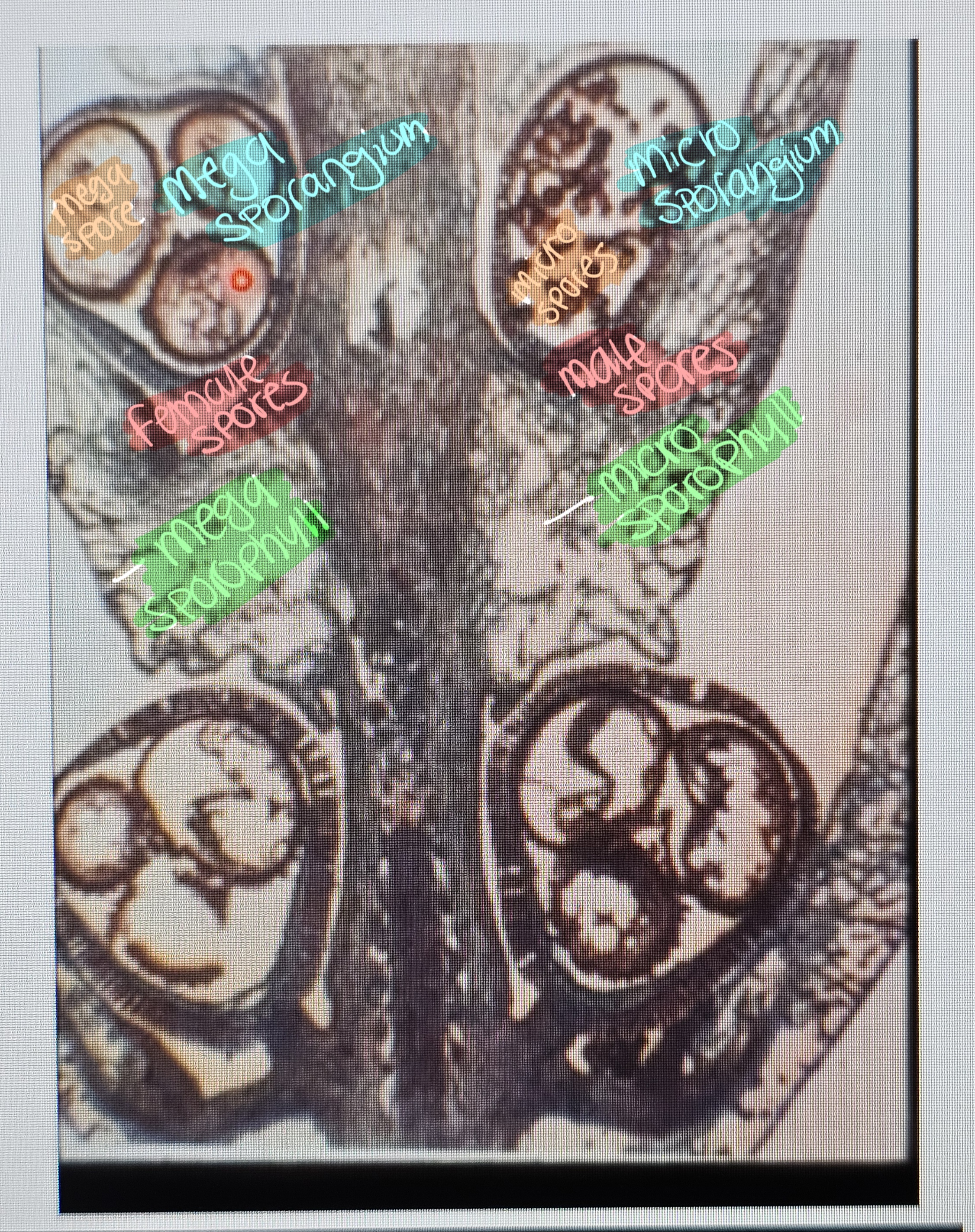 microsporangia w/microsporocytes (2N) → meiosis → microspores (1N) → mitosis → microgametophyte (1N)