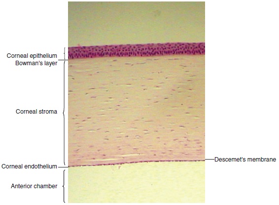 Stroma: Major component of cornea, ~500 µm thick, contains collagen fibrils, keeps the cornea transparent.