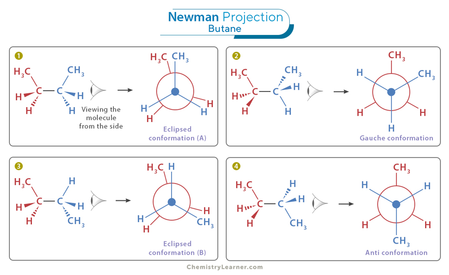 Newman projection- front carbon is represented by a dot while back carbon is represented by a circle