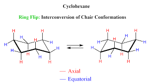 cyclohexane changes via a ring flip, it does nor stay in a single chair confirmation. In a ring flip, up Carbons become down carbons and down carbons become up carbons. during a ring flip, any subs that are axial become equatorial and any subs that are equatorial become axial.