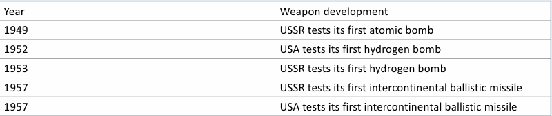 From 1949 onwards, both the USA and USSR rapidly developed atomic and hydrogen bombs, followed by ICBMs in 1957. The constant competition to stay ahead intensified mistrust and global insecurity.