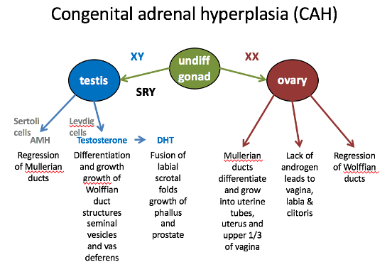 4. CAH | Excess androgen production due to enzyme block | Ambiguous genitalia or virilization. Risk of salt-wasting crisis. | Female or ambiguous. |