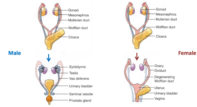 Wolfian (M): developed into vas deferens, epididymis and prostate