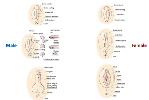 Differentiation: the process by which internal and external genitalia develop as male or female (develop morphological characteristics). The two processes are contiguous (occur side by side) and consist of several stages.