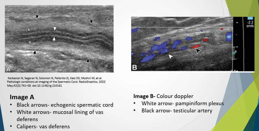 This is typically visualized using a longitudinal and/or oblique transducer orientation to visualize the course of the spermatic cord