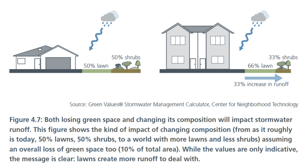 An increase in impermeable surfaces will considerably change how this water moves through the city. Remaining green spaces will help to regulate rain events to some degree, but their capacity to buffer extreme events will be more limited
