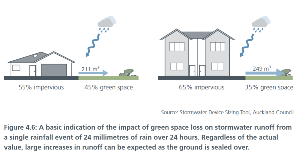 Climate change will mean the pattern of rainfall received by a typical Auckland suburb will be quite different 20 years from now. Increased atmospheric heat will mean that extreme rainfall events will occur with increasing frequency and intensity.31