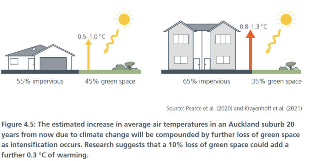 Even if our ‘typical’ Auckland suburb does not grow over the next 20 years, climate change means our green spaces will have to help mitigate between 0.5 and 1 °C of additional warming and have to deal with more weather extremes too. If ongoing intensification and infill development result in a continued loss of green space, then increasingly stressed ecosystems will be asked to do even more than they do now to help mitigate up to 1.3 °C of additional warming.