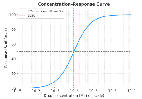 EC50 shows how much drug is needed, and Rmax shows the maximum response it can have.