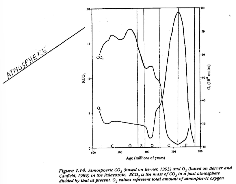 2 continents collided, pushed up a huge mountain range, huge forest across the tropic bury most carbon, are pushed into an ice age- polar ice cap at south pole