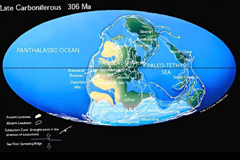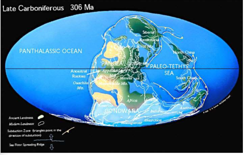 gondwana smashed into euramerica, pushed everything northwards, all the sediment in the ocean builds up into a mountain range, there is a massive ocean (panthalassic ocean) around the back of the world- can walk from top to bottom of the world