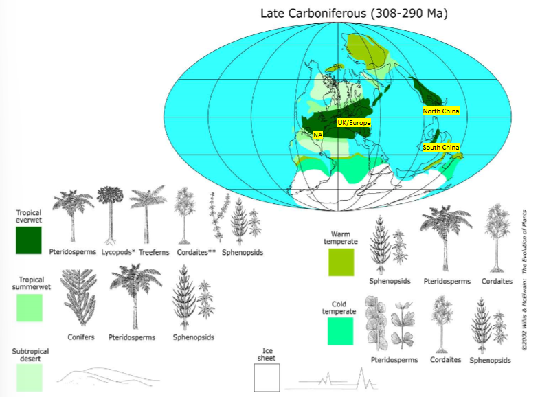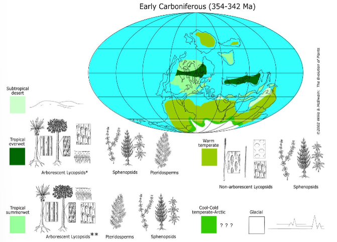 tropical everwet→ get coal measure rainforests at the equator, take out all the carbon in the atmosphere, have the most biomass ever, are dominated by lycopsids
