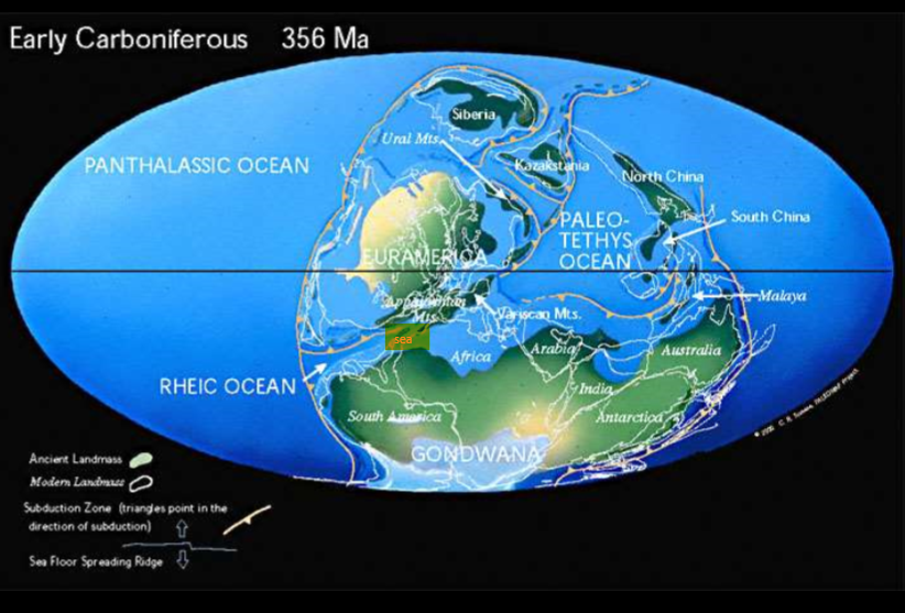 early C→ a little sea between euramerica and gondwana, massive ice sheet starts to develop on the south pole