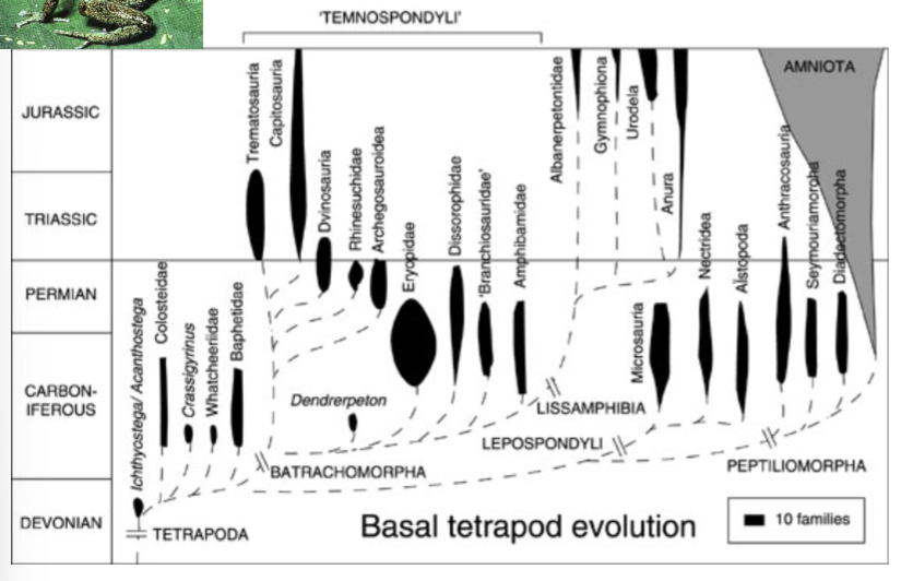 → there was a phylogenetically broad diversification where most basal tetrapod groups appeared quickly, all in the Carboniferous
