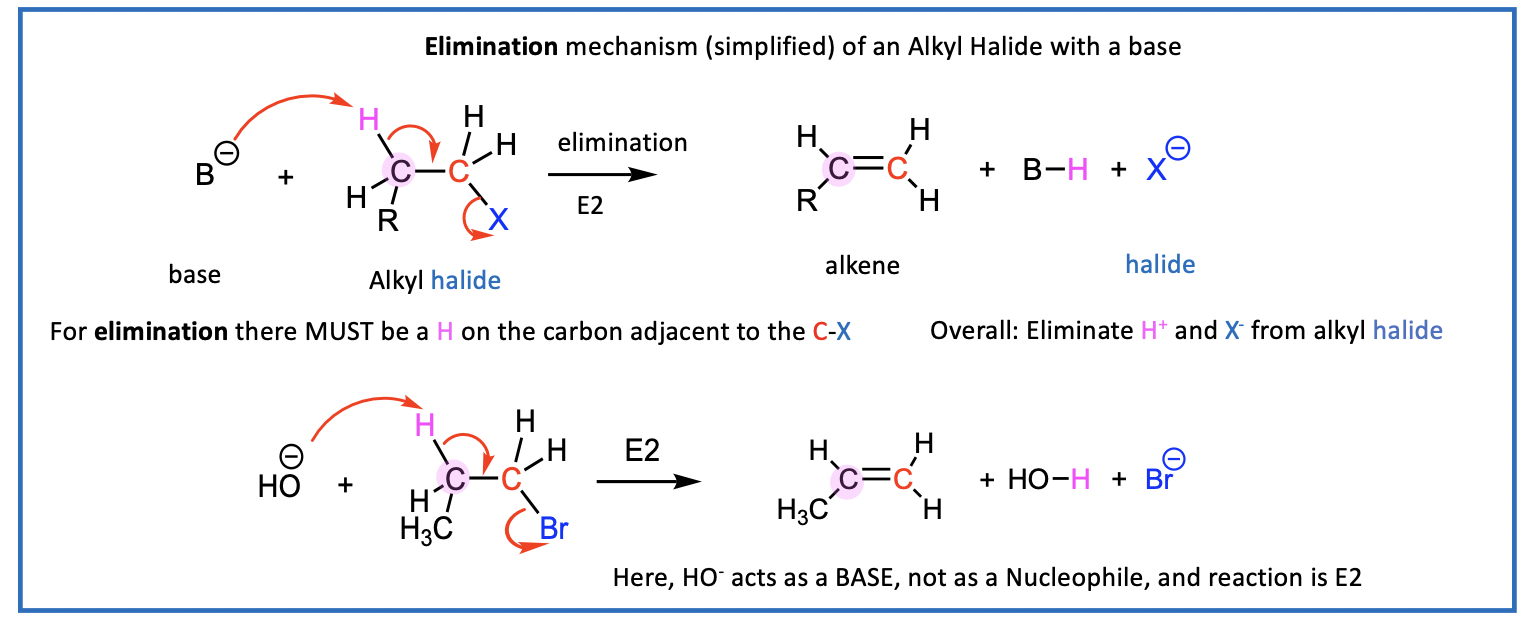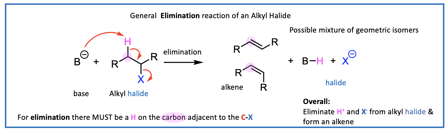 Overall: Eliminate H+ and X- from alkyl halide
