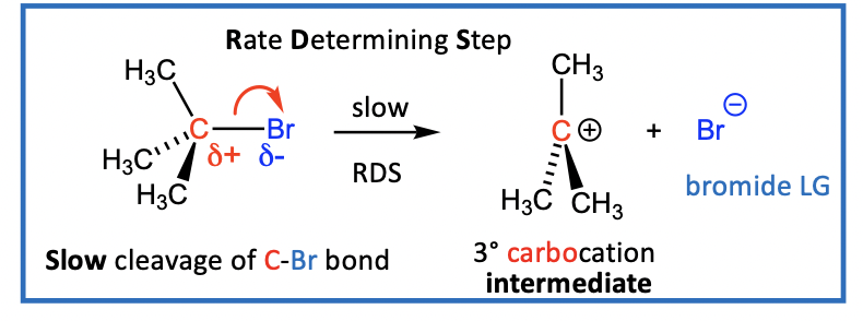 C-Br bond breaks to form carbocation (R3C+) and a halide (Br-)