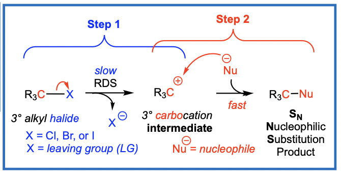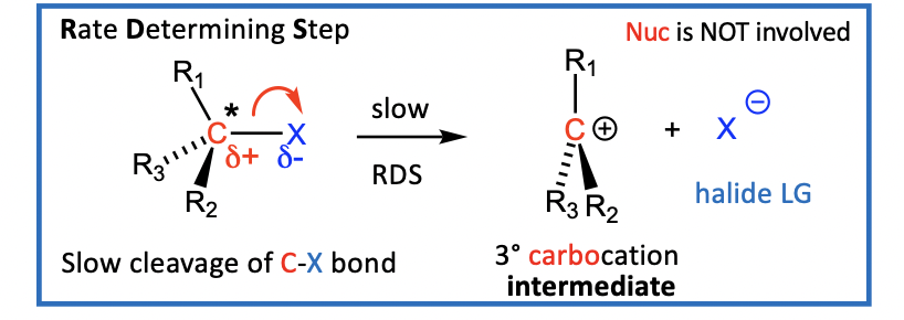 C-X bond cleaves to give a 3° carbocation intermediate (R3C+) and the leaving group, a halide (X-)