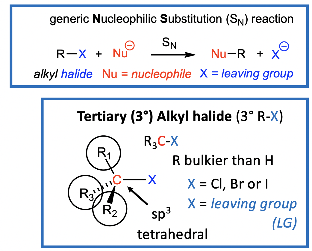 Remember: SN2 requires Nu to approach electrophilic C of R3C-X close enough to form a bond & displace the halogen leaving group, X